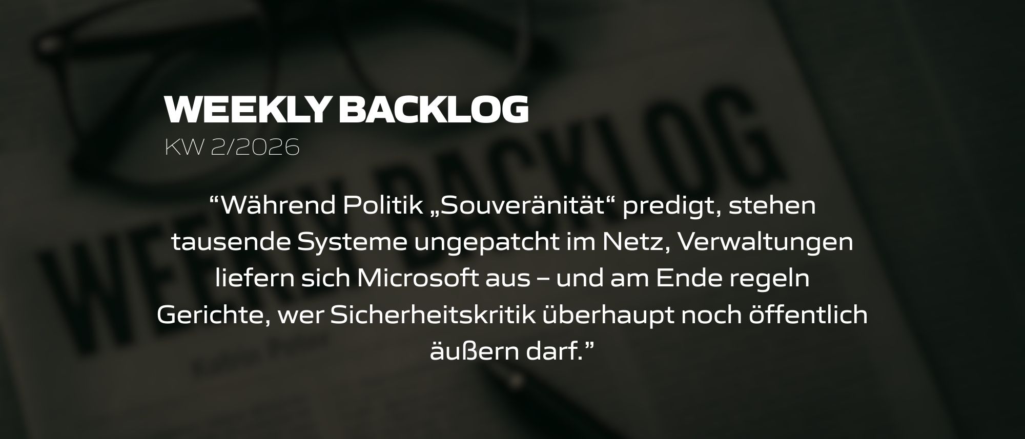 KW 2 fühlt sich an wie ein Déjà-vu in Dauerschleife. Kritische Sicherheitslücken, politische Abhängigkeiten, Cloud-Lock-ins – alles bekannt, alles dokumentiert, alles trotzdem weiter betrieben wie bisher. Während über digitale Souveränität konferenziert wird, liegen produktive Systeme ungepatcht im Netz. Während man sich auf „bewährte Plattformen" verlässt, steigen Preise und Abhängigkeiten. Und während Behörden gern auf Verantwortung verweisen, endet diese erstaunlich oft exakt an der eigenen Zuständigkeit.